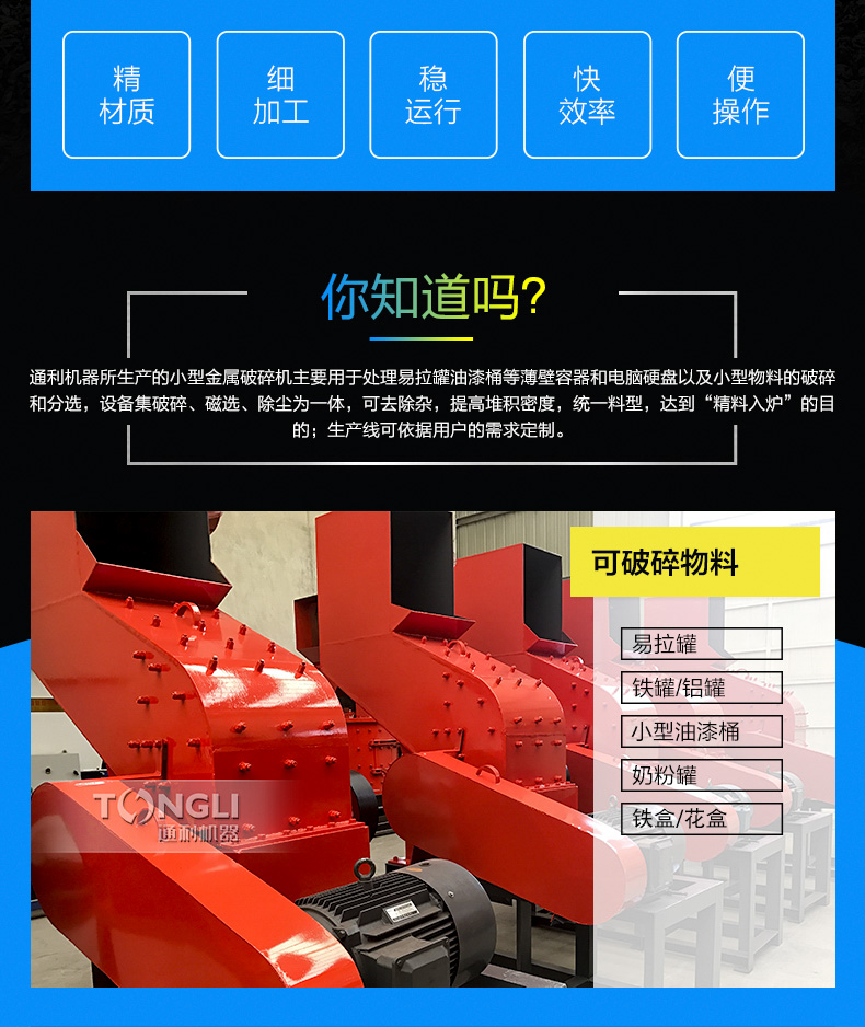 河南通利8010金屬破碎機由主機一臺,生產線一條,磁設備一臺,輸送機一臺,電機一臺組成,廠家可為您提供系列化的金屬破碎機和整個破碎工廠的工藝裝配配置。用于破碎輕薄料如汽車外殼混合廢金屬,包括金屬打包塊的破碎,機器通過不斷、化以及經驗的積累,掌握了設計和制造金屬破碎機的技術訣竅,從而設備長期可靠地低成本運行。