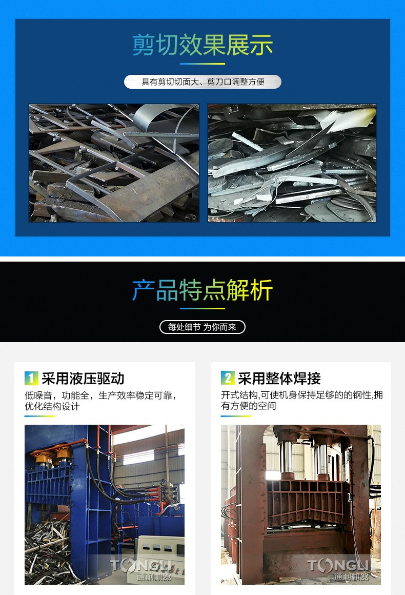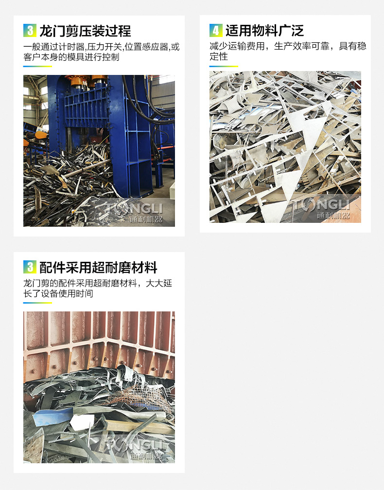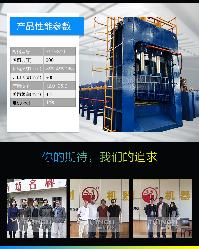 龍門式液壓剪切機適用于金屬回收加工廠、報廢汽車拆解場、冶煉鑄造行業,對各種金屬進行冷態剪斷,加工成合格爐料。河南通利龍門式剪切機,剪切力800噸至1250噸。剪切次數每分鐘4~5次。該系列需簡單基礎設施。采用液壓驅動,與機械傳動式剪切機相比具有體積小、重量輕、運動慣性小、噪音低、運作平穩、操作靈活、剪切斷面等特點。液電一體化控制、可實行單次、連續動作轉換、使用簡單方便、可在任意工作位置停止、運行、易于實現過載保護。適用范圍廣泛,既可作金屬回收加工單位的加工設備,又可作為工廠鑄造車間的爐料加工和機械建筑行業的金屬剪斷加工設備。
