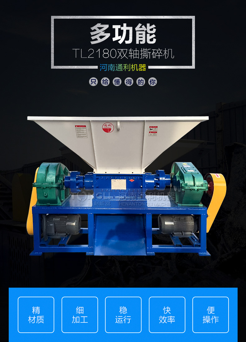 雙軸撕碎機又名剪切式撕碎機,通過剪切、撕裂和擠壓達(dá)到減小物料尺寸、刀具的厚度和刀爪數(shù)量可根據(jù)不同物料換。撕碎中空物料時可配備壓料裝置提產(chǎn)量。另可添加旋轉(zhuǎn)篩網(wǎng)控制出料尺寸。低轉(zhuǎn)速運行,噪音和粉塵可達(dá)到較的標(biāo)準(zhǔn)。通利撕碎機經(jīng)過多年研究與實踐,并根據(jù)實際情況進行改進,推出技術(shù)成熟和設(shè)計的金屬撕碎機系列,為的廢物回收利用前期的破碎,減容處理提供質(zhì)量可靠的設(shè)備。