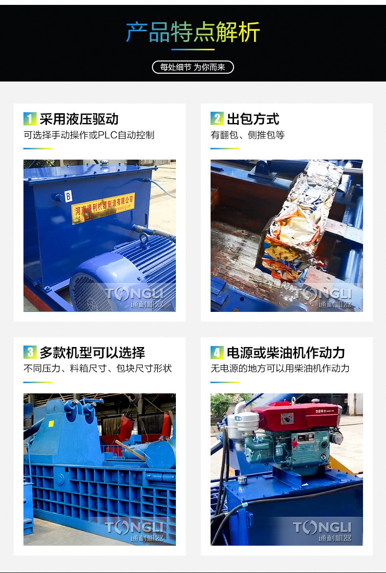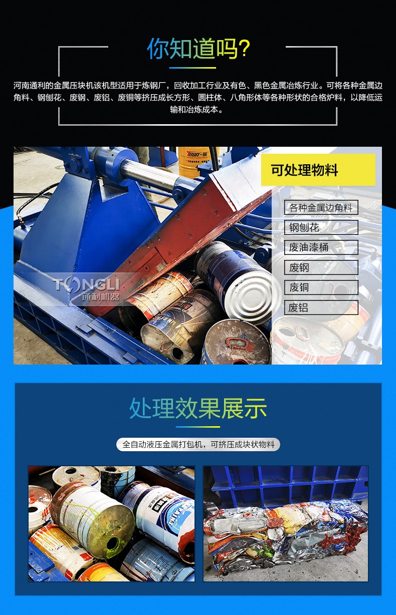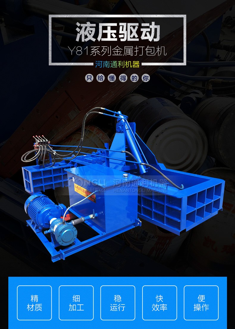 金屬打包機主要應用于回收加工行業及金屬冶煉行業??蓪⒏鞣N金屬邊角料、鋼刨花屑、廢鋼、廢鐵、廢銅、廢鋁、鋁刨花屑、解體汽車殼、廢油桶等金屬原料擠壓成長方體。便于儲藏、運輸及回爐再利用。